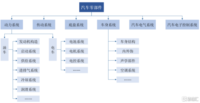 汽车零部件主要由动力系统、传动系统、底盘系统、车身系统、汽车电气系统和汽车电子控制系统这六大系统构成。