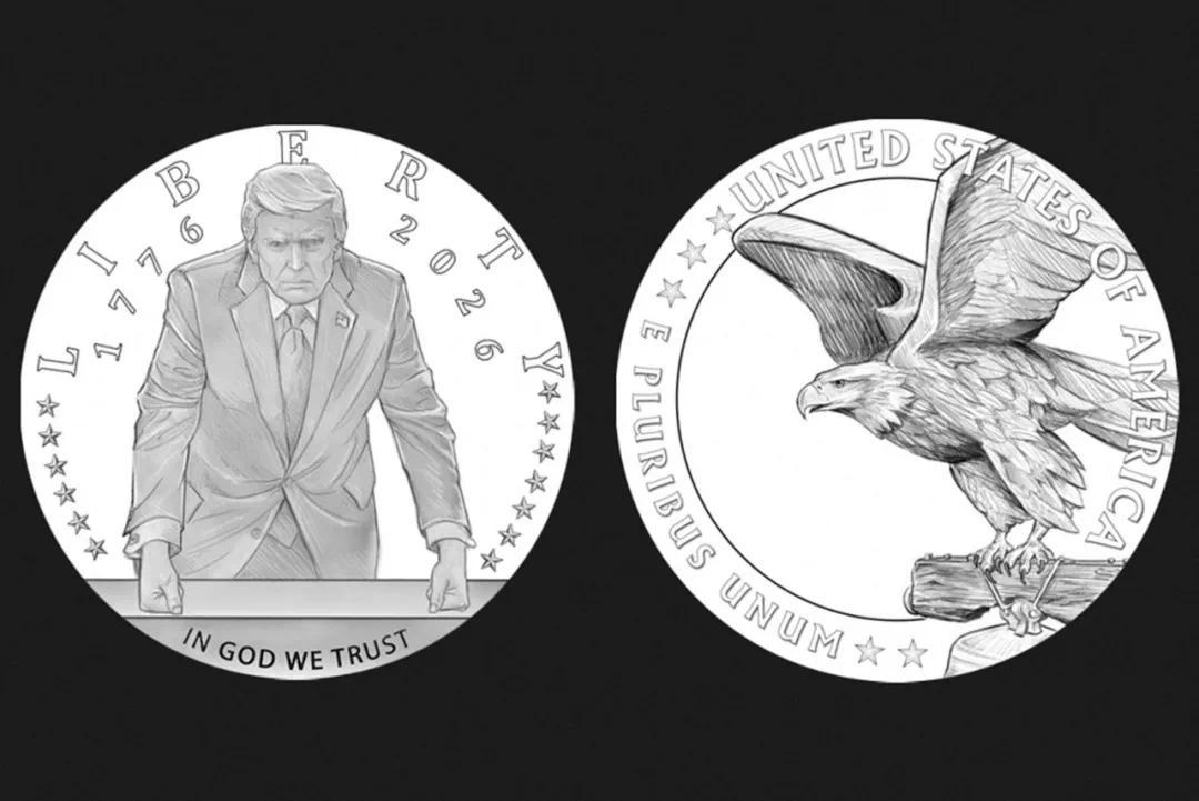 这枚24K金币旨在纪念今年7月4日美国建国250周年,画面中特朗普双拳按在桌面上。