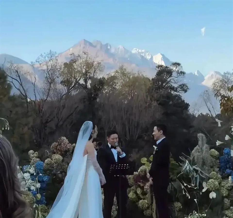 婚礼选在云南玉龙雪山牦牛坪,海拔三千多米,宾客一边吸氧一边举杯。 现场没有水晶吊灯,没有鲜花拱门,白色纱幔配原木桌椅,雪山就是天然背景板。 有张照片特别搞笑——一位亲友左手举着氧气瓶,右手端着酒杯,网友调侃“别人婚礼喝多了吐,这场婚礼吸多了晕”。